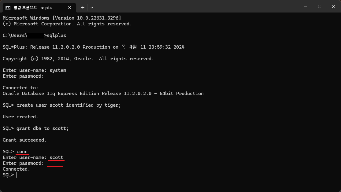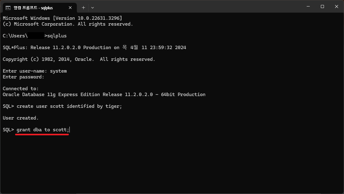 grant dba to scott; 명령을 입력하여 계정에 관리자 권한을 위임합니다.