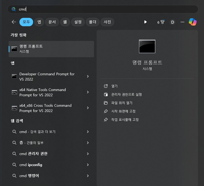 Win + R 단축키로 실행창을 열어 cmd를 입력해도 실행 가능합니다.