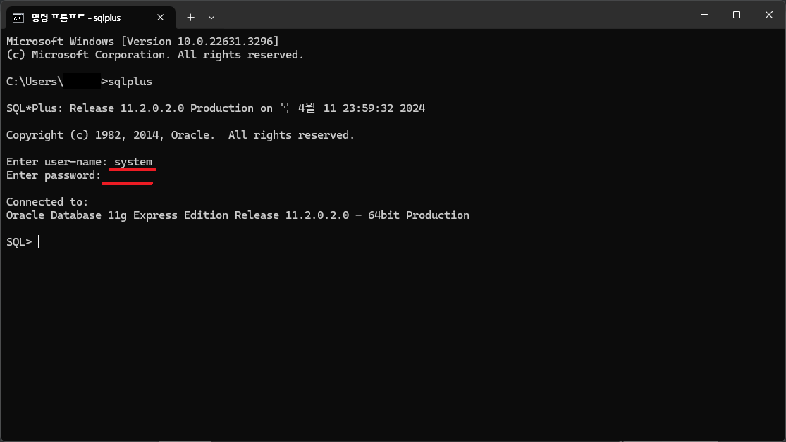 설치가 정상적으로 진행되었다면 설치된 오라클의 버전이 표시됩니다.