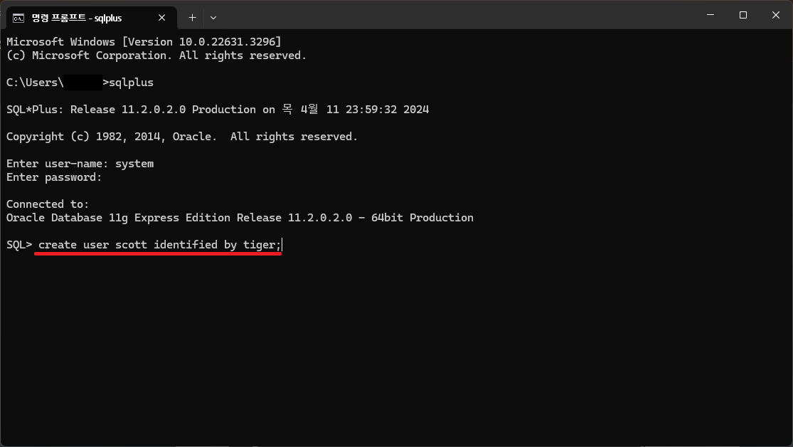 user-name : scott, password : tiger 라는 계정을 생성하는 명령입니다.